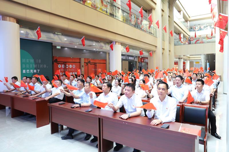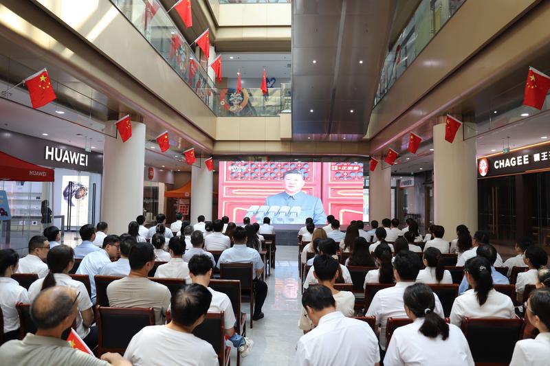 金贸集团组织员工集中观看九三阅兵直播发表时间:2025-09-03 15:16 2025年9月3日上午,纪念中国人民抗日战争暨世界反法西斯战争胜利80周年大会在北京天安门广场隆重举行。金贸集团组织各直属单位、分公司(项目部),以及集团机关各部门负责人和员工代表共100多人,齐聚科技广场中央商务区——古月年华商业中心一楼中庭,集中观看了这场气势恢宏的阅兵仪式直播,感受祖国的强大与民族的团结。